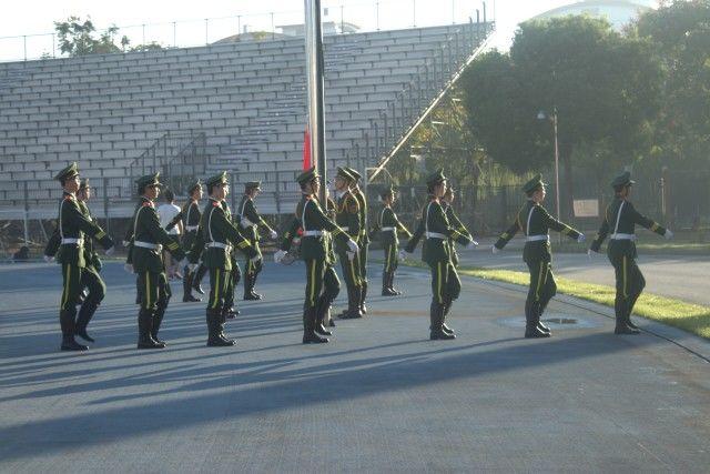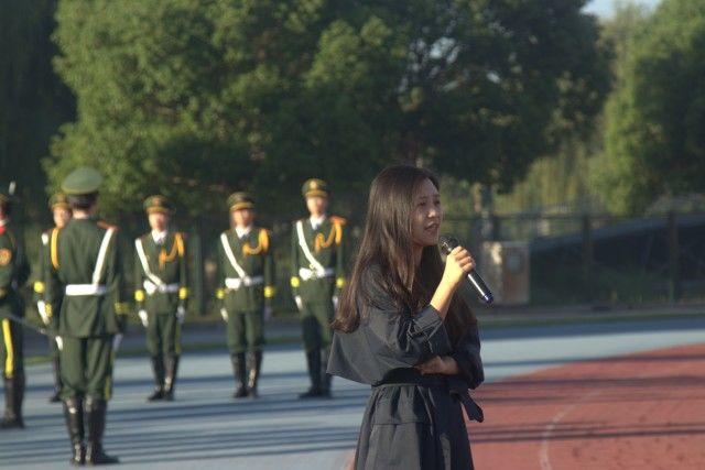 天高云淡,金桂飘香,迎着朝阳,国旗护卫队护旗手入场,他们口号响亮、军步整齐,正步走来。随后,伴随着《义勇军进行曲》的激扬旋律,升国旗、奏国歌,全体师生行注目礼,庄严肃立,此时此刻,每个人脸上洋溢着微笑,心中都涌动着浓浓的自豪感。仰望蓝天,五星红旗迎风飘扬,冉冉升起的五星红旗激发了同学们不断向上的斗志,点燃了同学们的爱国热情。