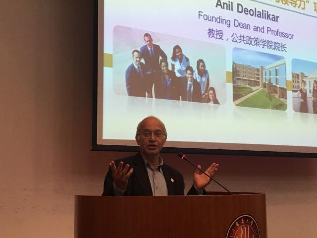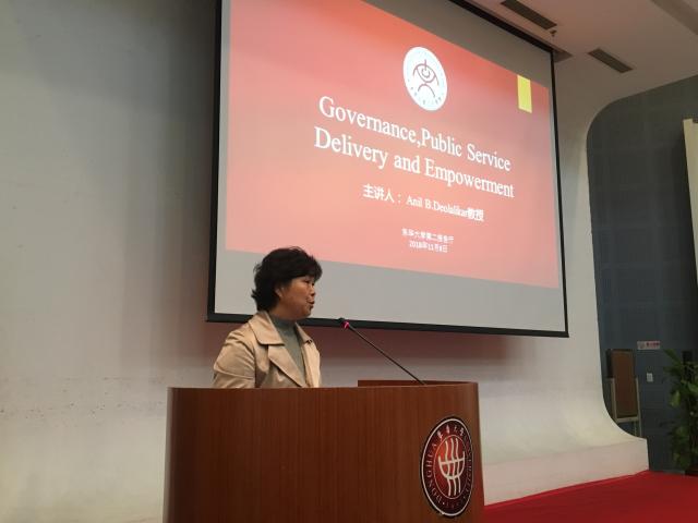 2018年11月8日下午,美国加州大学河滨分校公共政策学院院长Anil B. Deolalikar访问Beat365官方网站,并在图文信息第二报告厅,为Beat365官方网站师生作了题为《亚洲发展中国家的授权与公共服务提供》的学术报告,Beat365官方网站党委书记王英出席本次活动并致欢迎辞,Beat365官方网站王锐兰教授,副教授刘奕、尹艳华、邓志锋一同出席本次活动。