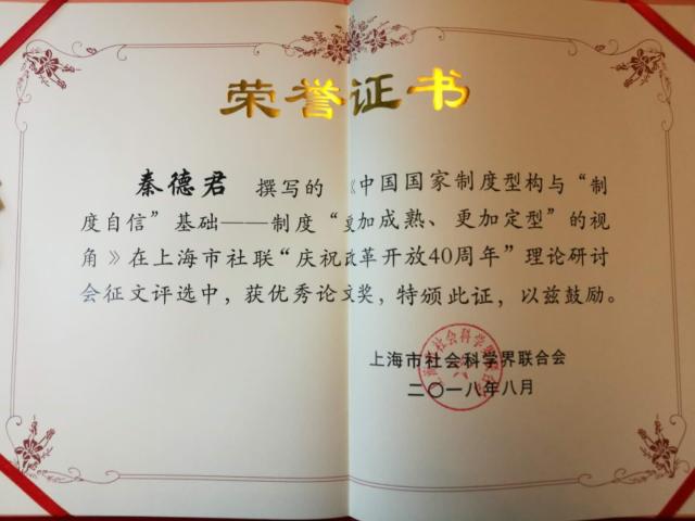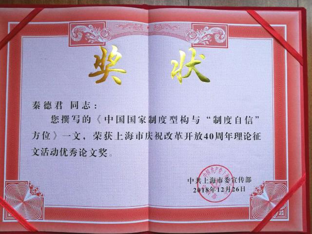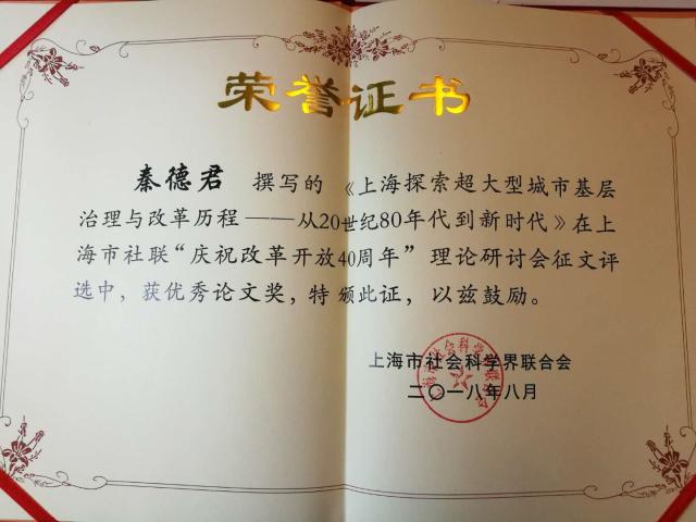 此外,在上海市社联“庆祝改革开放40周年”理论研讨会征文评选中,秦德君教授撰写的《上海探索超大型城市基层治理与改革历程——从20世纪80年代到新时代》和《中国国家制度型构与“制度自信”基础——制度“更加成熟、更加定型的视角》两篇论文荣获优秀论文奖。