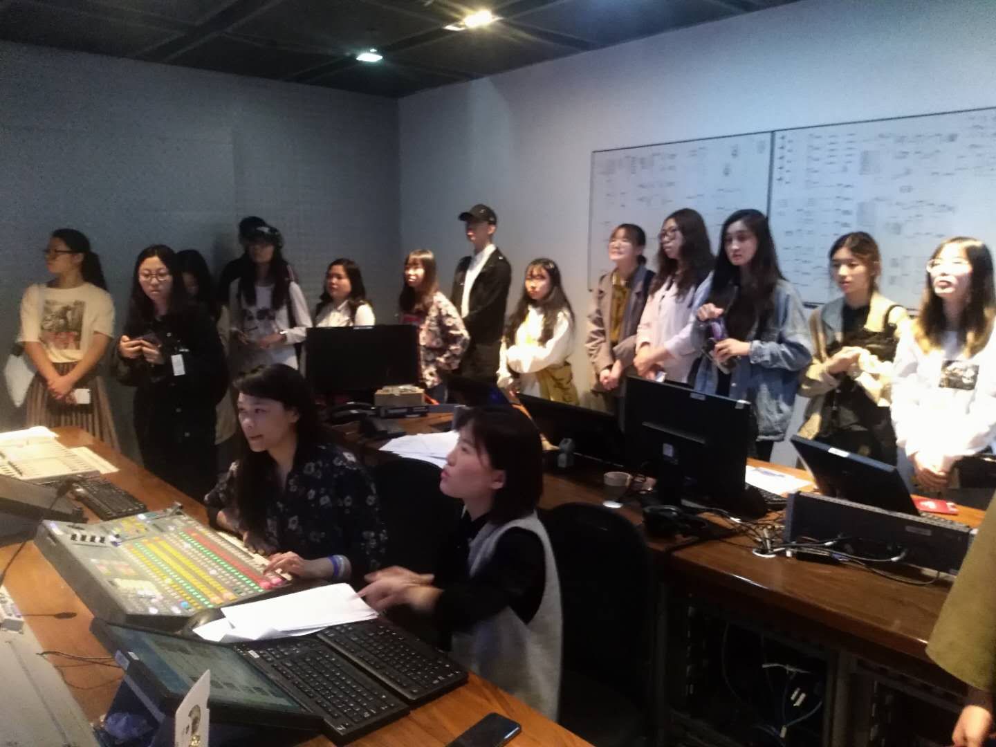 下午2时,本次实地学习活动正式开始。活动分为两个部分,参观考察和座谈交流。首先,在老师的带领下,同学们参观了录制节目的演播厅,零距离观摩了电视节目的录制过程,接触到了最先进、最专业的器材,这种体验,对许多同学来说还是第一次。之后,同学们又在配音室里体验了专业的配音设备,在控制中心学习了电视节目制作以及直播技术的相关知识。