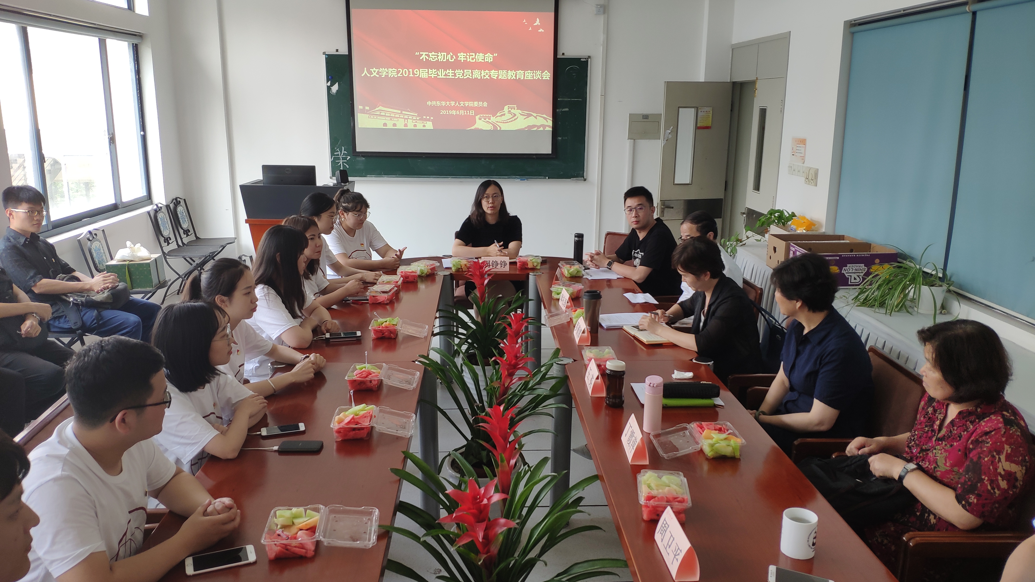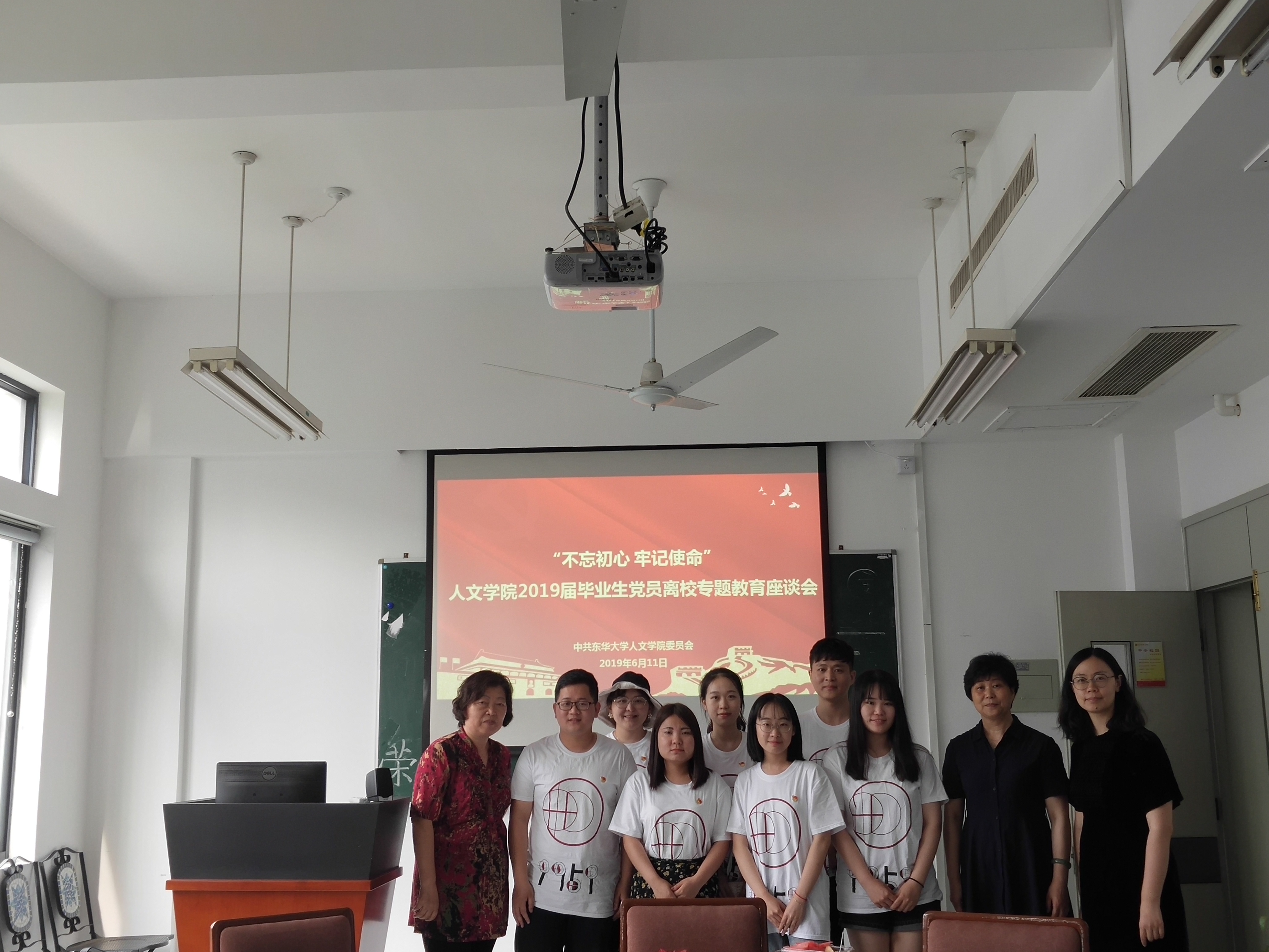 2019届毕业生离校再即,为确保毕业生安全、稳定、文明、愉快离校,有效推进平安校园、文明校园与和谐校园建设,切实做好毕业生党员离校前集中学习教育和组织关系转移管理等有关工作,Beat365官方网站党委结合学院实际情况,于2019年6月11日,开展了以“不忘初心,牢记使命”为主题的毕业生党员离校专题教育座谈会。Beat365官方网站党委书记王英、副书记罗薇娜,Beat365官方网站关工委丁霞萍,Beat365官方网站党委委员章礼强、叶长海、周卫平、周铮铮,以及毕业班辅导员、各学生党支部书记与Beat365官方网站2019届毕业生党员出席本次活动。