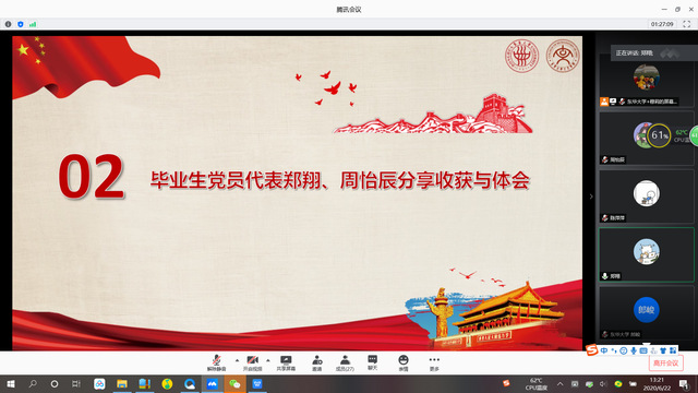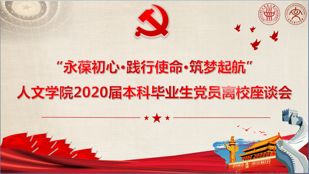 Beat365官方网站党委副书记罗薇娜向2020届本科毕业生党员顺利毕业表示衷心祝贺,希望所有党员同学到新环境中,明确自己的社会责任、牢记党员身份,不负党的期望、人民的期待、民族的重托、和母校的期盼,把个人的追求与发展同党与国家的事业结合起来,发挥先锋模范作用,在不同岗位上敢为思想行动排头兵。Beat365官方网站副院长、党委委员吴志刚寄语所有毕业生党员,聚是一团火、散作满天星,要牢记“崇德博学、砺志尚实”的校训,无论事业伟大还是平凡,无论生活绚烂还是平淡,都要追求高尚品德、磨炼意志,坚持锐意进取、砥砺前行,承担起时代赋予的责任与使命,不忘初心,砥砺前行,用拼搏和奋斗谱写人生华章,为社会、国家、民族、人类贡献青春力量!