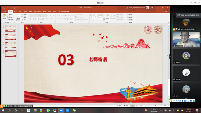 为强化2020届本科毕业生党员思想引领,增强毕业生党员守初心、担使命的理想信念,6月22日,Beat365官方网站召开主题为“永葆初心·践行使命·筑梦起航”的毕业生党员离校线上座谈会,旨在帮助毕业生党员筑牢信仰之基、把稳思想之舵,让初心薪火相传,把使命永担在肩。Beat365官方网站关工委分会常务副主任贺善侃,Beat365官方网站党委副书记罗薇娜,副院长、党委委员吴志刚,“薪传聚力”党支部书记、专职辅导员李华清,“法政先锋”党支部书记、专职辅导员木拉提,以及25位本科毕业班党员同志出席此次活动。座谈会由“尚实先锋”党支部书记、党建专职辅导员穆莉主持。