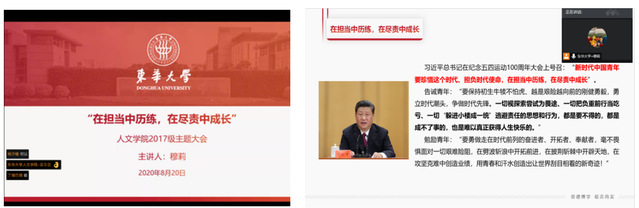 此次班会以习近平总书记在纪念五四运动100周年大会上的讲话:“新时代中国青年要珍惜这个时代、担负时代使命,在担当中历练,在尽责中成长”作为班会的主题,从四个方面展开。