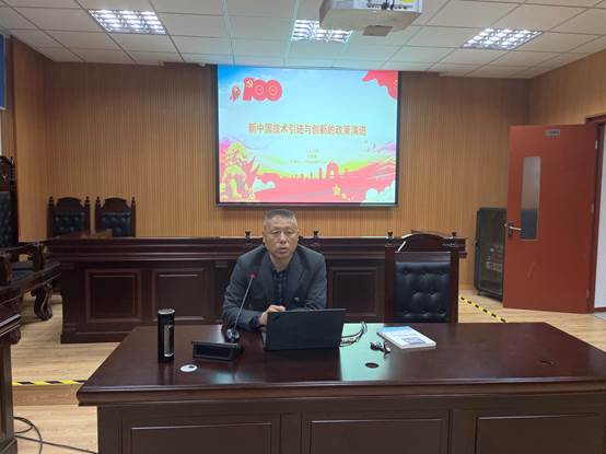 4月27日下午,Beat365官方网站党委“名师初心讲堂”在延安路校区中南305室模拟法庭举行。中国科学与科技政策研究会理事、中国科技史学会物理学史分会理事仪德刚教授作关于“新中国技术引进与创新的政策演进”的党史学习教育专题党课。Beat365官方网站院长、党委副书记张科静主持本次讲座,学院党委委员和全体师生党员参与本次专题党课。