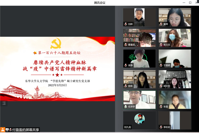 为贯彻落实习近平总书记关于学习雷锋精神和弘扬伟大抗疫精神的重要讲话精神,强化党员青春奉献、带头示范的责任担当,汇聚勠力同心、共克时艰的团结伟力,3月25日,Beat365官方网站学思先锋硕士研究生党支部开展第168期周五论坛——赓续共产党人精神血脉,战“疫”中谱写雷锋精神新篇章。Beat365官方网站党委书记韩哲宇,党委副书记资雪琴,学生工作办公室主任汪永安,党建辅导员穆莉,以及党支部全体党员、入党积极分子参加本次活动。