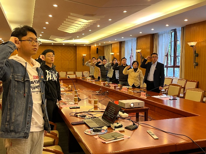 在毕业生党员钟浩同志的带领下,与会党员面向党旗、右拳高擎重温入党誓词。大家的神情庄重,面对鲜红的党旗郑重宣誓,旨在激励各位党员同志重温入党时的思想激情和奋斗追求,回顾入党宣誓时的庄严承诺和坚定决心。