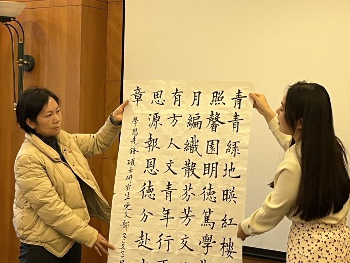 毕业生党员姜云同志代表2023届毕业生党员送上了一份独特的礼物:原创诗词书法作品《暮春别东华园敬赠》,诗句声声入耳,铿锵有力,描绘着学子们对过往的感激与珍重,对未来的思索与想象。学院党委副书记资雪琴老师代表学院接受了赠礼。