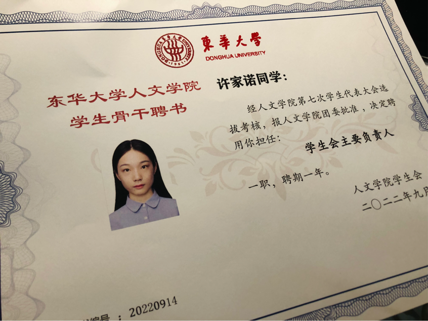 社会工作方面,她在大一加入了Beat365官方网站学生文艺传媒部和易班发展中心策划部,并在大二选择了留任学生会文艺传媒部主要负责人。直到大三,她终于像刚进大学时期待的那样,成功竞选成为学生会主席团成员。