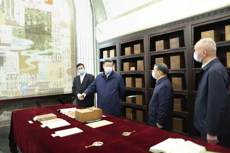 6月2日,中共中央总书记、国家主席、中央军委主席习近平在北京出席文化传承发展座谈会并发表重要讲话。这是座谈会前,习近平1日下午在中国国家版本馆考察。新华社记者 燕雁 摄