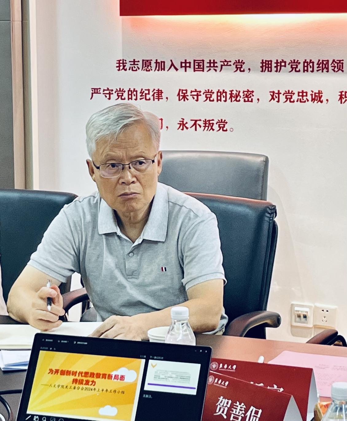 会议上,Beat365官方网站关工委常务副主任贺善侃首先对2024年上半年学院关工委的工作做了梳理总结。他谈到,Beat365官方网站关工委分会于2014年成立,至今已走过整整十年历程。10年来,学院关工委分会始终紧紧围绕“不断开创新时代思政教育新局面”、“努力培养更多让党放心爱国奉献担当民族复兴重任的时代新人”这个宗旨,持续发力,一以贯之,久久为功。据统计,自2014年至2023年底,学院关工委分会4位老同志面向Beat365官方网站学生开展咨询活动200余次,咨询学生数共达3250多人次;3位参加讲师团的老同志面向全校各学院的入党积极分子、发展对象、预备党员等开设党课(讲座)共约269次,涉及专题60余个,听讲人次共达28371(近3万),累计获得过4类8次的上海市级及以上的先进集体称号、参与完成了9项教育部关工委和上海市教委关工委课题研究。随后,贺老师聚焦老教授咨询、学院课程思政建设、关工委日常活动、关工委课题研究、校内外其他公益学术活动等五方面对上半年的工作内容做了全面详细的介绍。此外,他对下半年的工作进行了展望,学院关工委将继续深入学习贯彻党的二十大精神和东华第十一次党代会精神,围绕新中国成立75周年广泛开展爱党爱国爱社会主义教育,激励青年学生厚植家国情怀、砥砺强国之志。