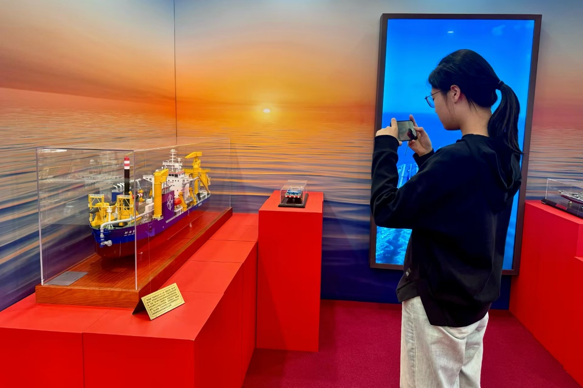 在尾厅,展览以“旭日东升”为主题,展示了中国商飞C919客机、福建号航母、嫦娥六号探测器等大国重器的模型。这些模型不仅让同学们感受到了历史的厚重与时代的变迁,也透过一件件物料,深刻了解了新中国成立75年以来取得的伟大成就和祖国的强大与繁荣。