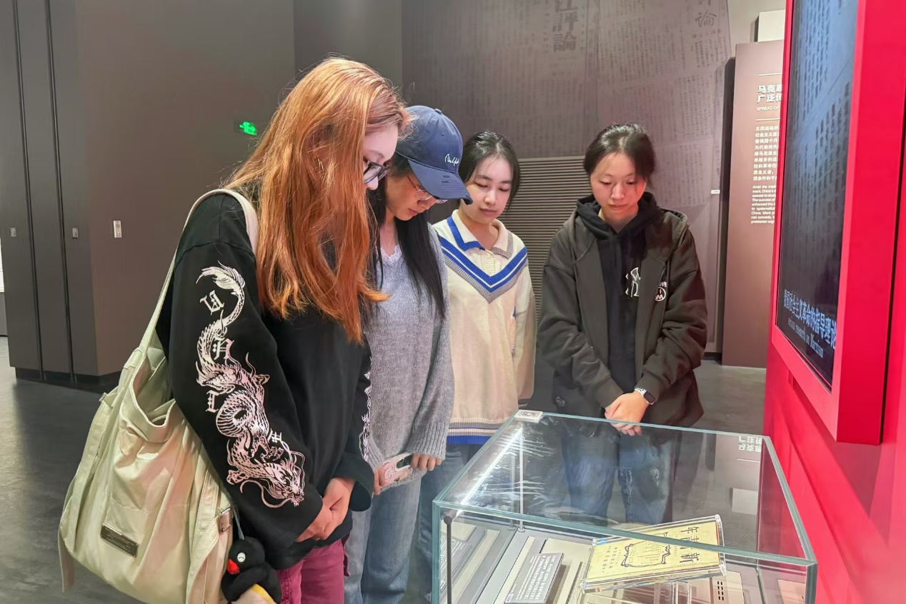 踏入“初光·旭日——庆祝新中国成立75周年文物专题展”的展厅,同学们被注明年份的光带吸引,沿着这条历史的足迹,直观地感受从共产党成立走向新中国成立的艰辛历程;在光阴灯带里穿梭,明晰到国家何以一路走向辉煌。此次展览依托中共一大纪念馆丰富的革命文物资源,包括党的早期领导人使用过的器物、革命时期的重要文献,以及反映新中国成立与建设成就的实物。同学们纷纷表示,这些文物不仅串联起从共产党成立到新中国成立的壮丽篇章,而且生动诠释了“没有共产党就没有新中国”的深刻内涵。
