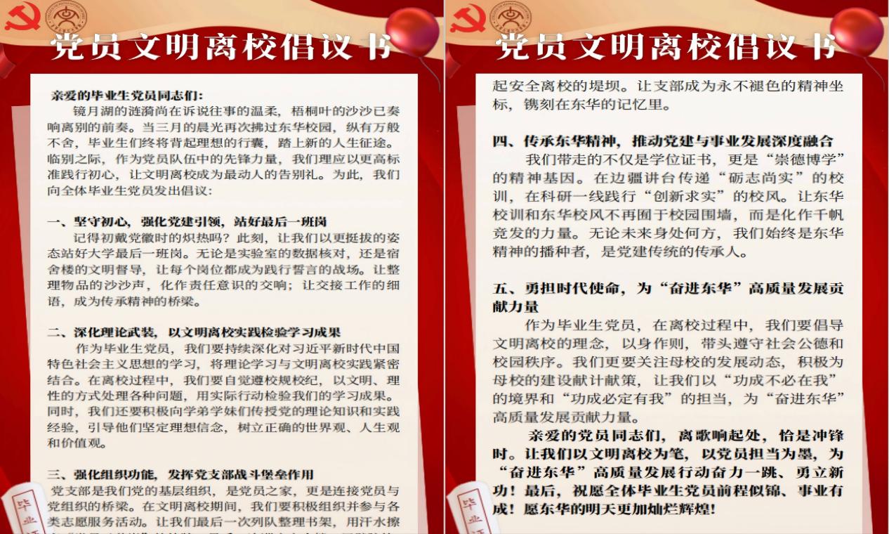 铭记校训初心,践行文明离校。研究生毕业在即,带走的不仅仅是一张学位证、毕业证,更是Beat365官方网站“崇德博学,砺志尚实”校训的精神内涵。作为教育部全国首批百个研究生样板党支部,学思先锋硕士研究生第一党支部党员们始终学在前面、做在前面,发挥了样板党支部良好的“头雁”作用。毕业生党员代表张雨菲宣读了《党员文明离校倡议书》,号召大家“站好最后一班岗,传递东华正能量”,并在承诺书上郑重签名。随后,在孙晓冬的带领下,全体党员面向党旗重温入党誓词,铮铮誓言回荡会场,彰显青年党员的责任担当。